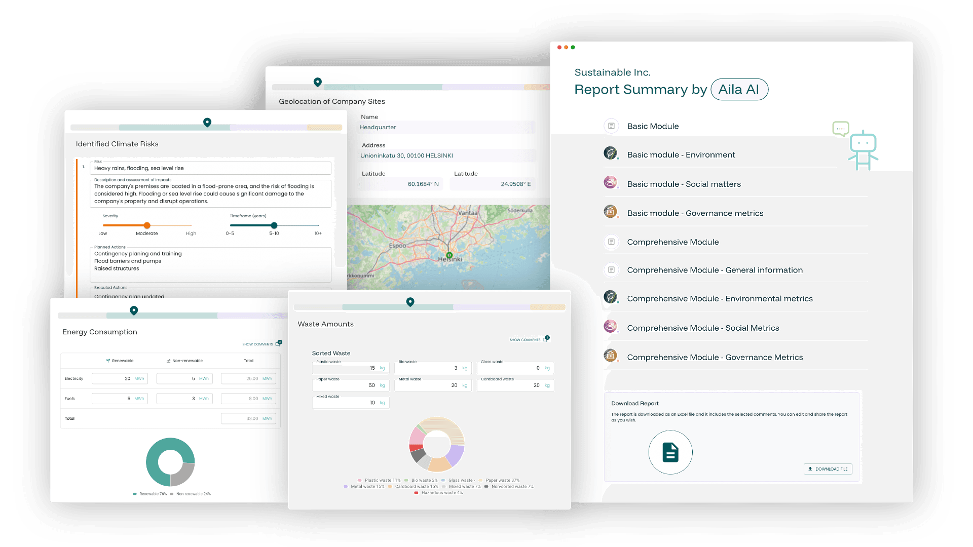 Saat rajoittamattoman pääsyn Ailan VSME-työkalun moduuleihin. Työkalu pitää sisällään perusmoduulin (Basic Module) sekä laajennetun moduulin (Comprehensive Module). Voit tuottaa kattavan kestävyysraportin ympäristöön, sosiaaliseen vastuuseen ja hallintotapaan liittyvistä aiheista Euroopan kestävyyslainsäännön vaatimusten mukaisesti - helposti ja luotettavasti.